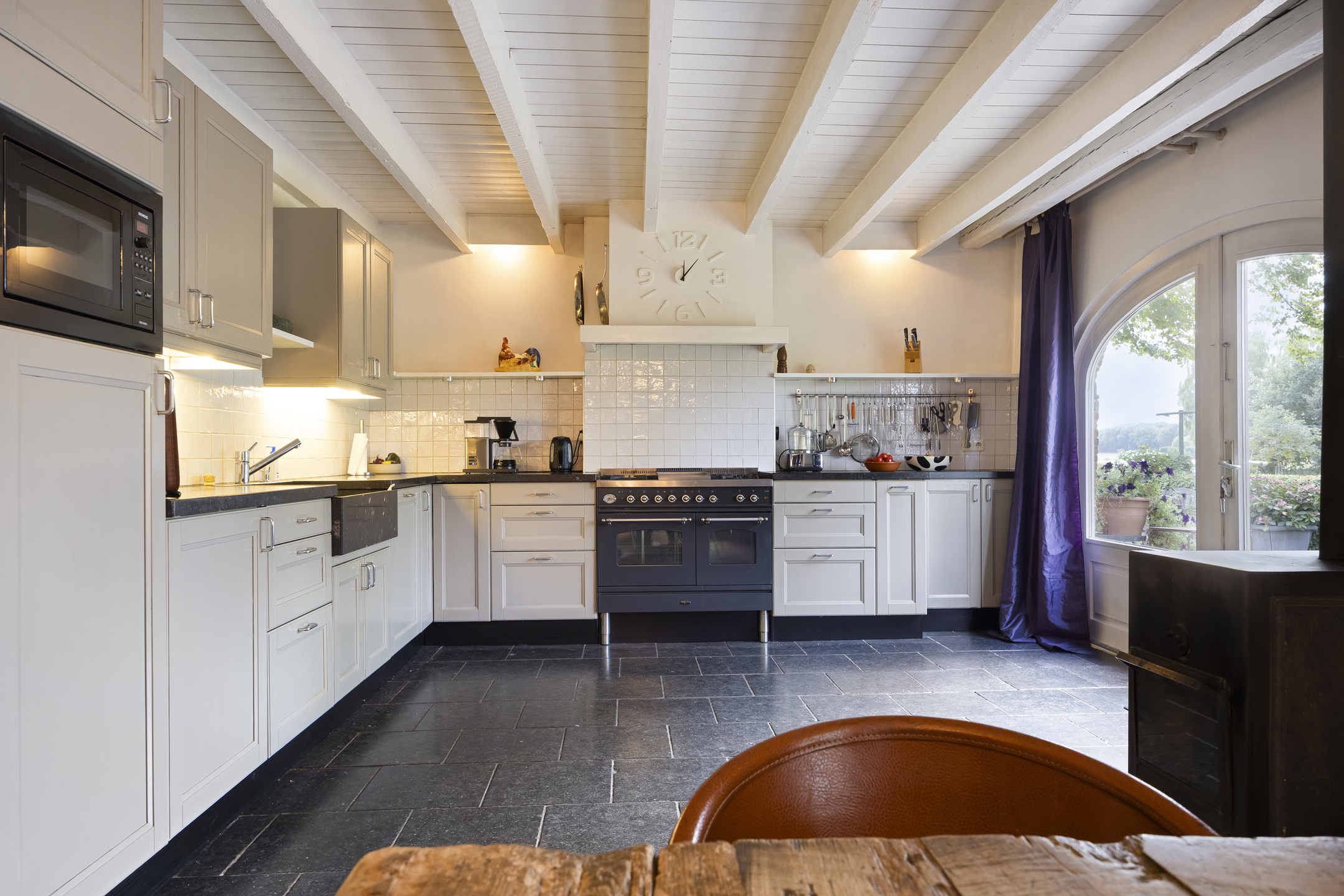 Spacious kitchen-diner featuring a corner-installed fitted kitchen with natural stone worktop and double sink, built-in gas hob, refrigerator, microwave, dishwasher and extractor hood; also equipped with a wood-burning stove; tiled and plastered walls, oak herringbone floor partly combined with natural stone flooring; ceiling finished with wooden panelling and exposed beams; French doors to the garden/terrace;