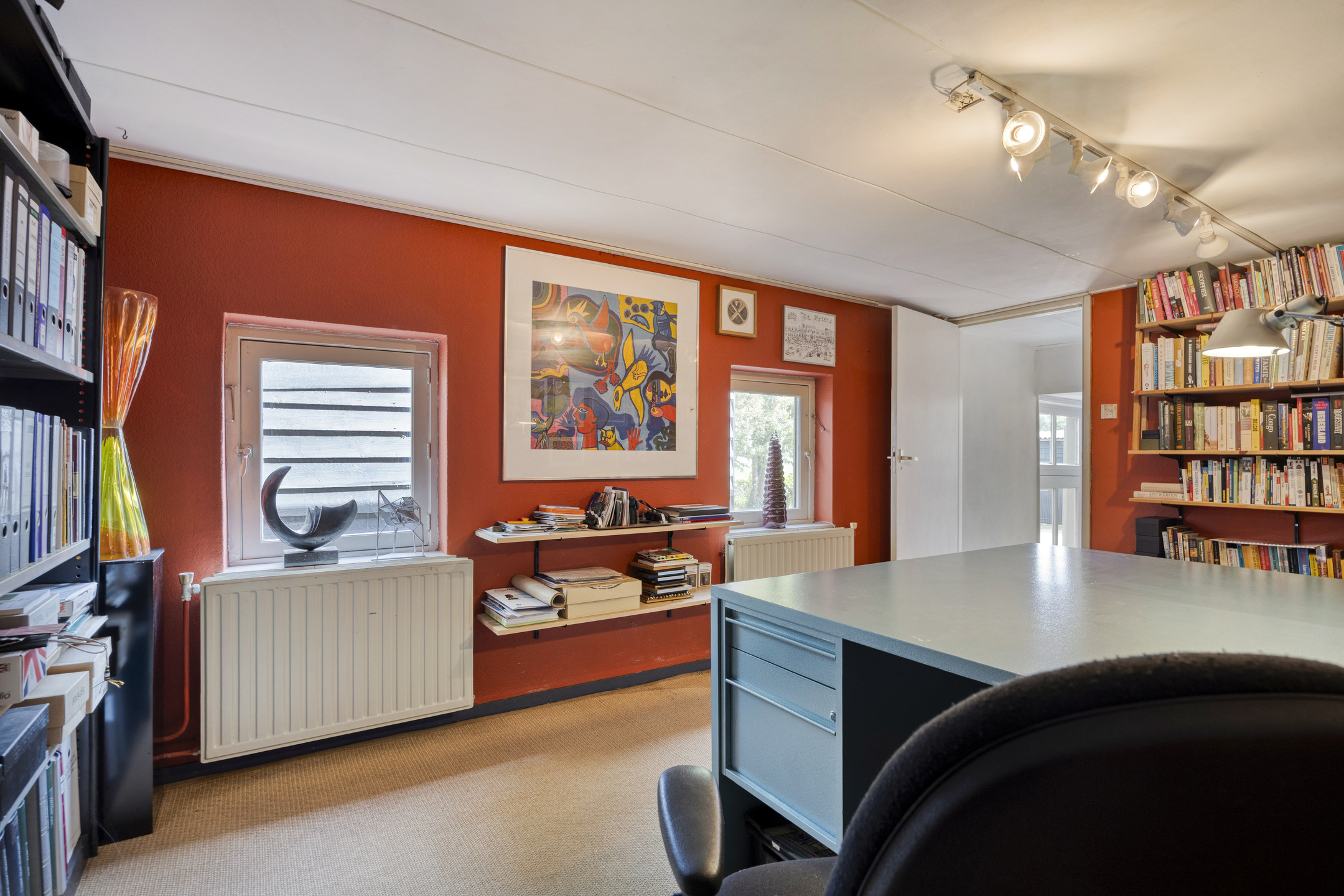 Intermediate room currently used as an office; plastered walls, herringbone floor, ceiling finished with board panels;