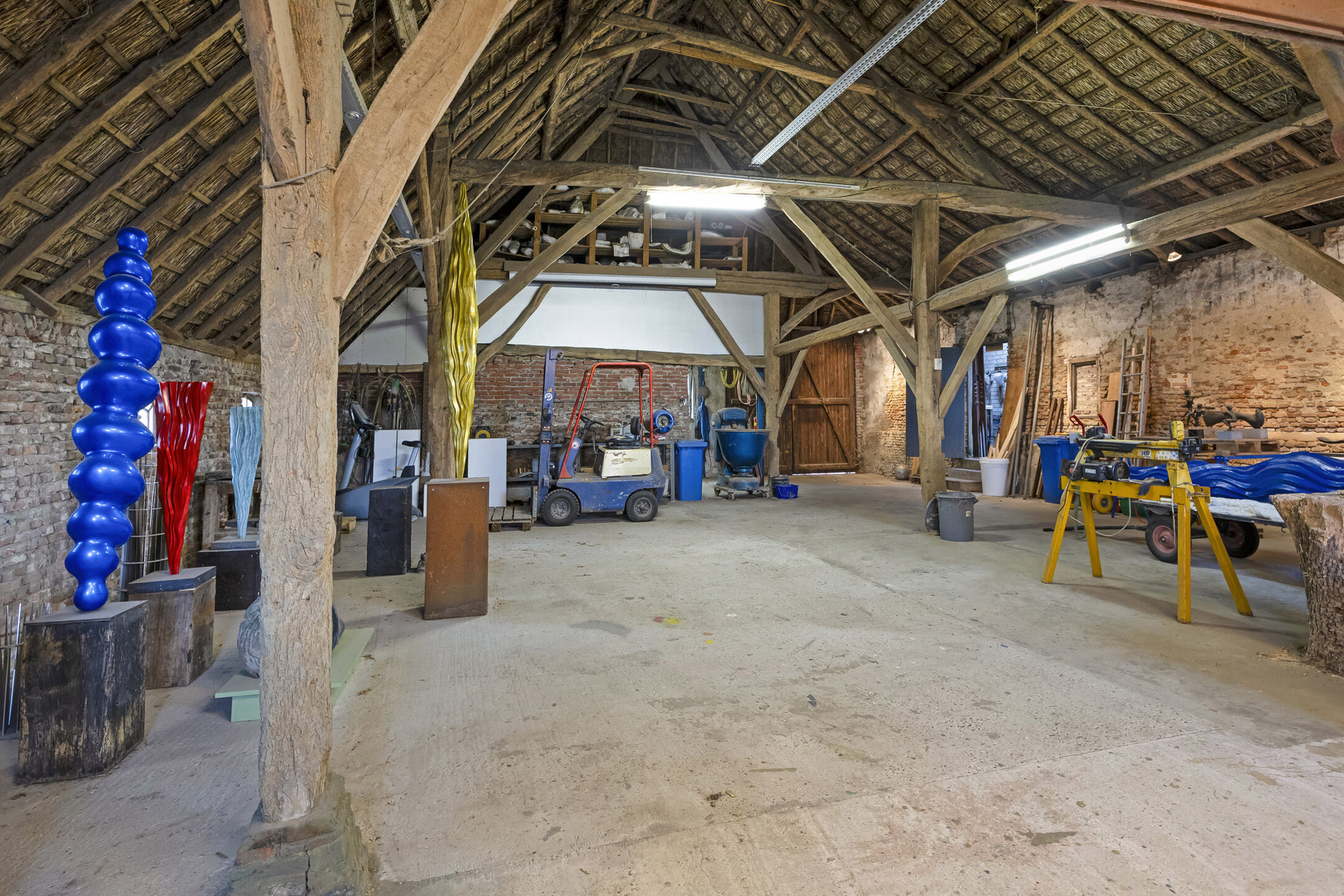 Outdoors, there are two spacious barns of approximately 302 m² and 49 m² respectively. The larger barn still showcases much of its original roof structure, with the full wooden framework visible—an impressively robust and characterful space, ideal for working but also perfect for hosting the occasional celebration.