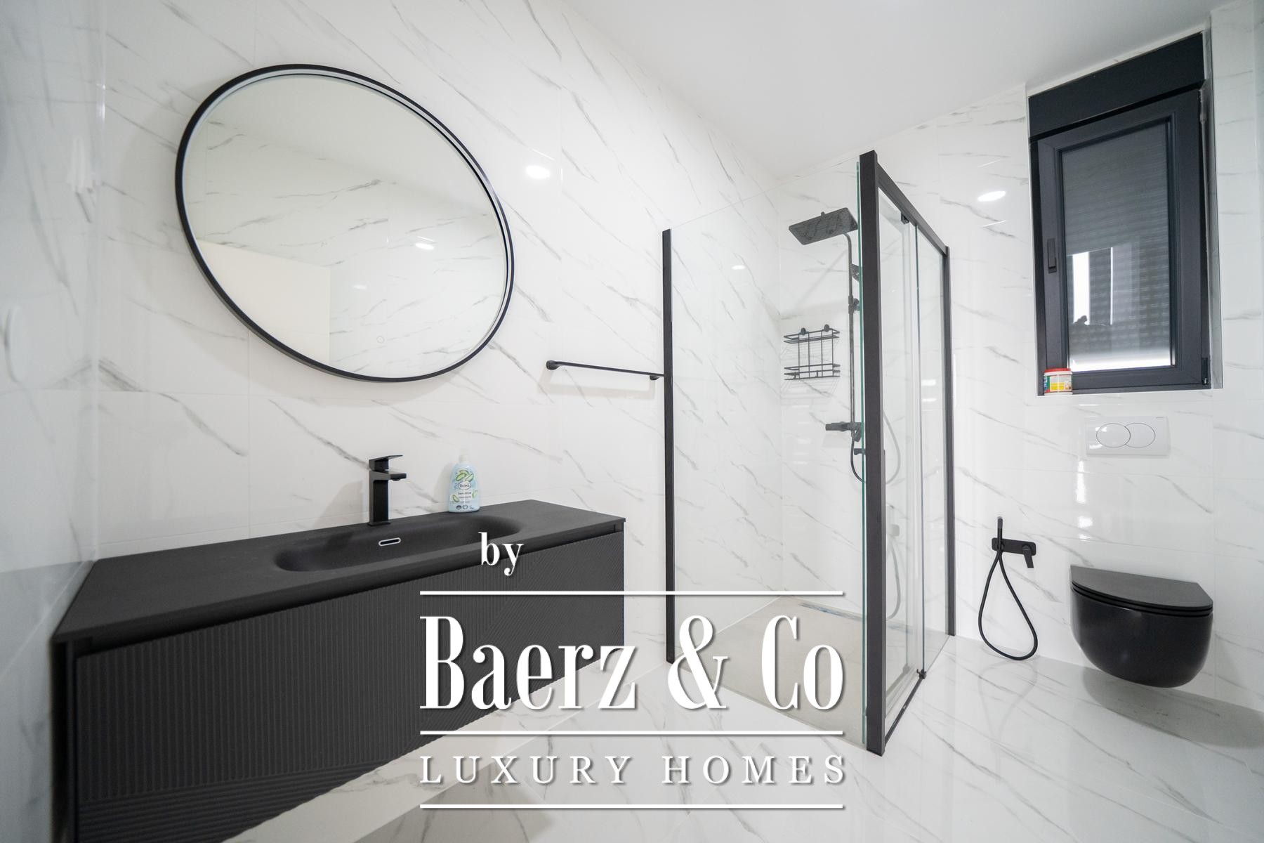 On the ground floor, natural light flows across the expansive living room leading to a terrace, inviting outdoor living. The adjoining kitchen and dining area are designed for both functionality and conviviality. The floor also includes a bathroom, a laundry room, and a dedicated gym space, underscoring the focus on comfort and well-being. Upstairs, three bedrooms and two bathrooms offer restful retreats, each with access to another terrace and panoramic views of Zadar's gentle landscape.