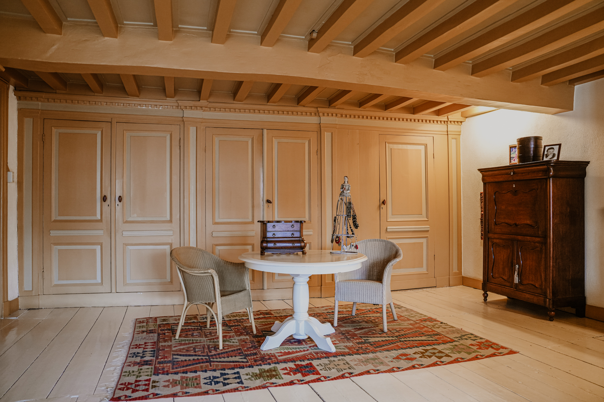 Above the kitchen is a study, accessed via a fixed staircase. From this room, there is a clear view of the rear facade of the property. Off the stairwell is a charming bedroom/study with herringbone parquet flooring and wooden paneling. Two large sash windows provide a view into the study above the kitchen.