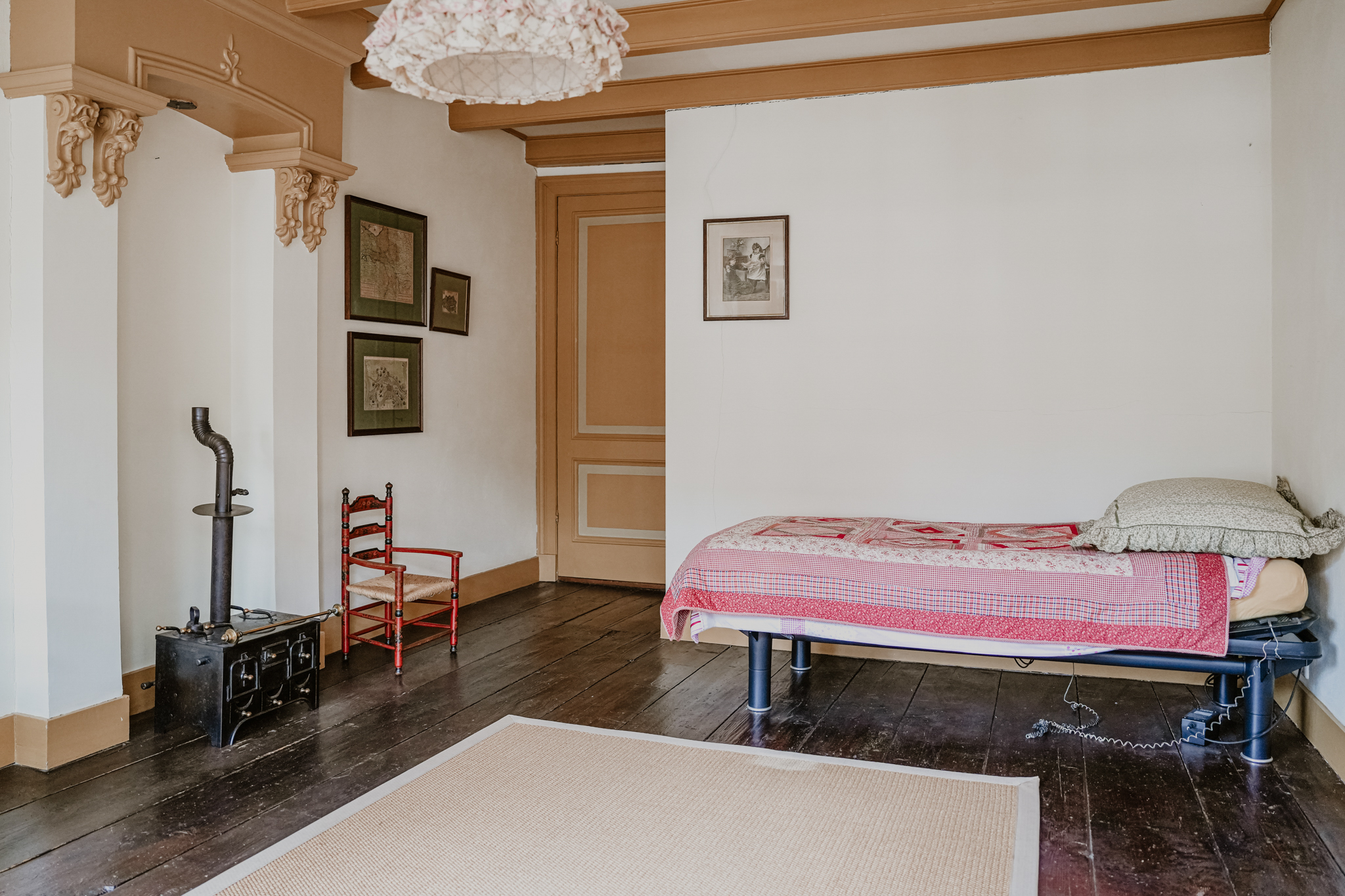 This floor radiates the atmosphere of the 16th century. At the front is a 40 m² bedroom that once served as a living room. Three large sash windows offer views of the broad Gasthuisstraat. The floor features wide wooden planks, and there are two built-in cupboards. At the rear is an even more imposing bedroom with a beam-and-rafter ceiling, white-painted wide floorboards, and a full-width fitted wardrobe with elegant panel doors. Two sash windows provide views of the garden.