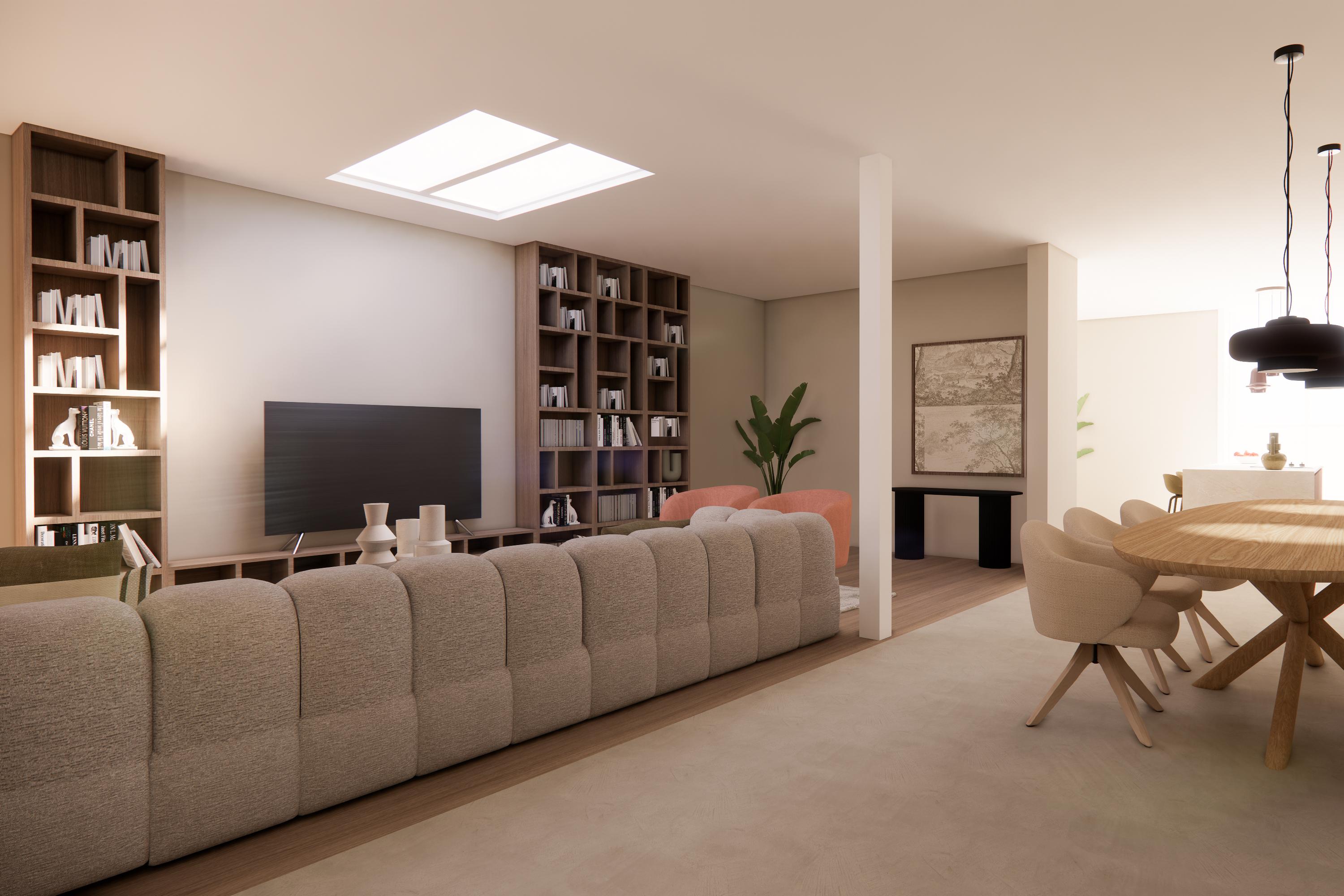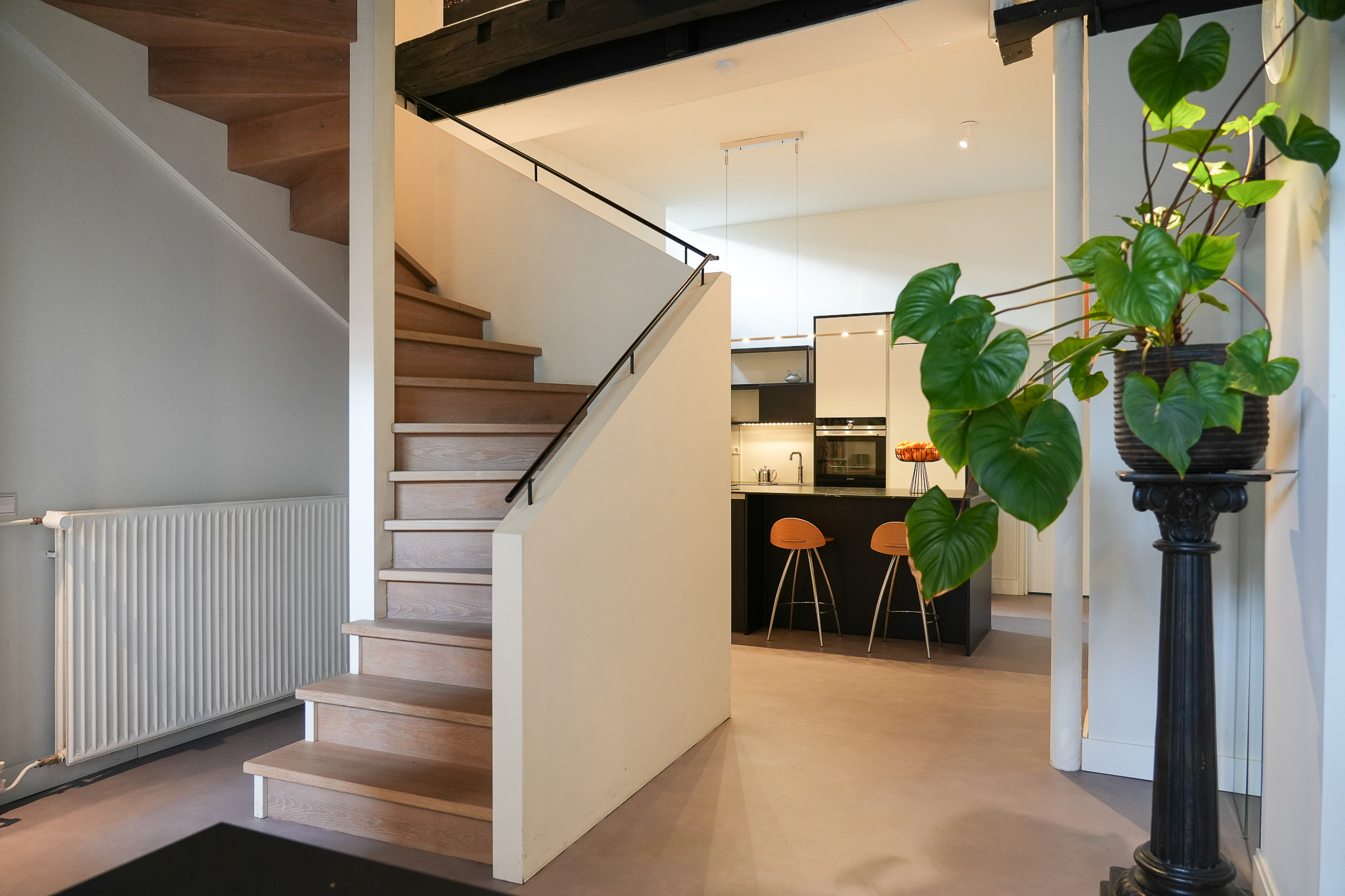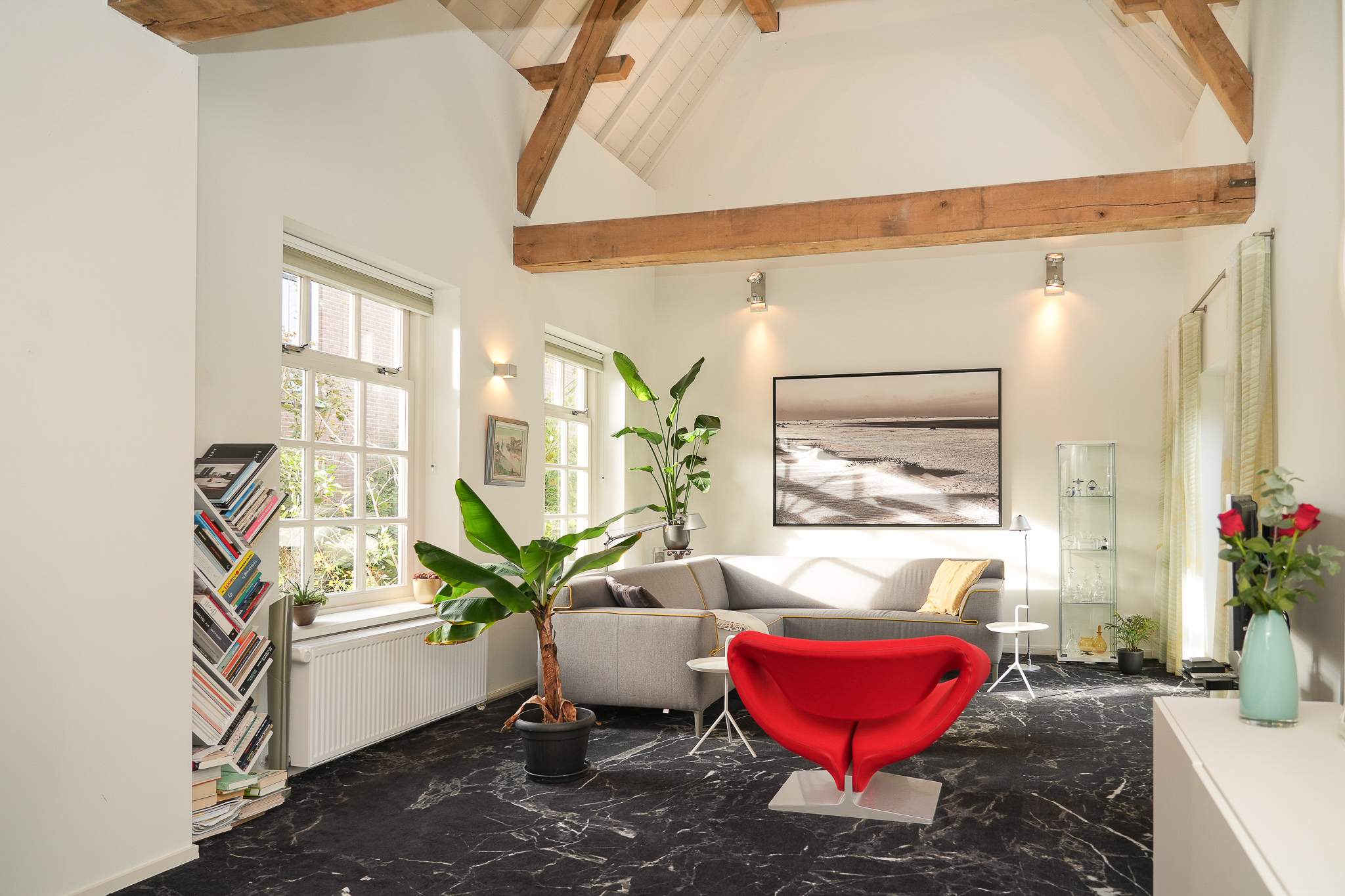 A wide contemporary staircase leads to the landing. At the rear is the slightly elevated living room with windows facing west, offering a view towards the marina. On the east side, double doors open onto the roof terrace. During the recent restoration, the ridge of the rear section was left fully exposed, creating a spectacular ceiling height of over 6.5 metres.