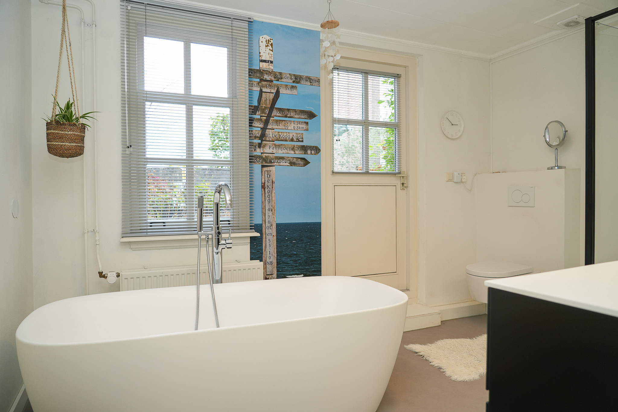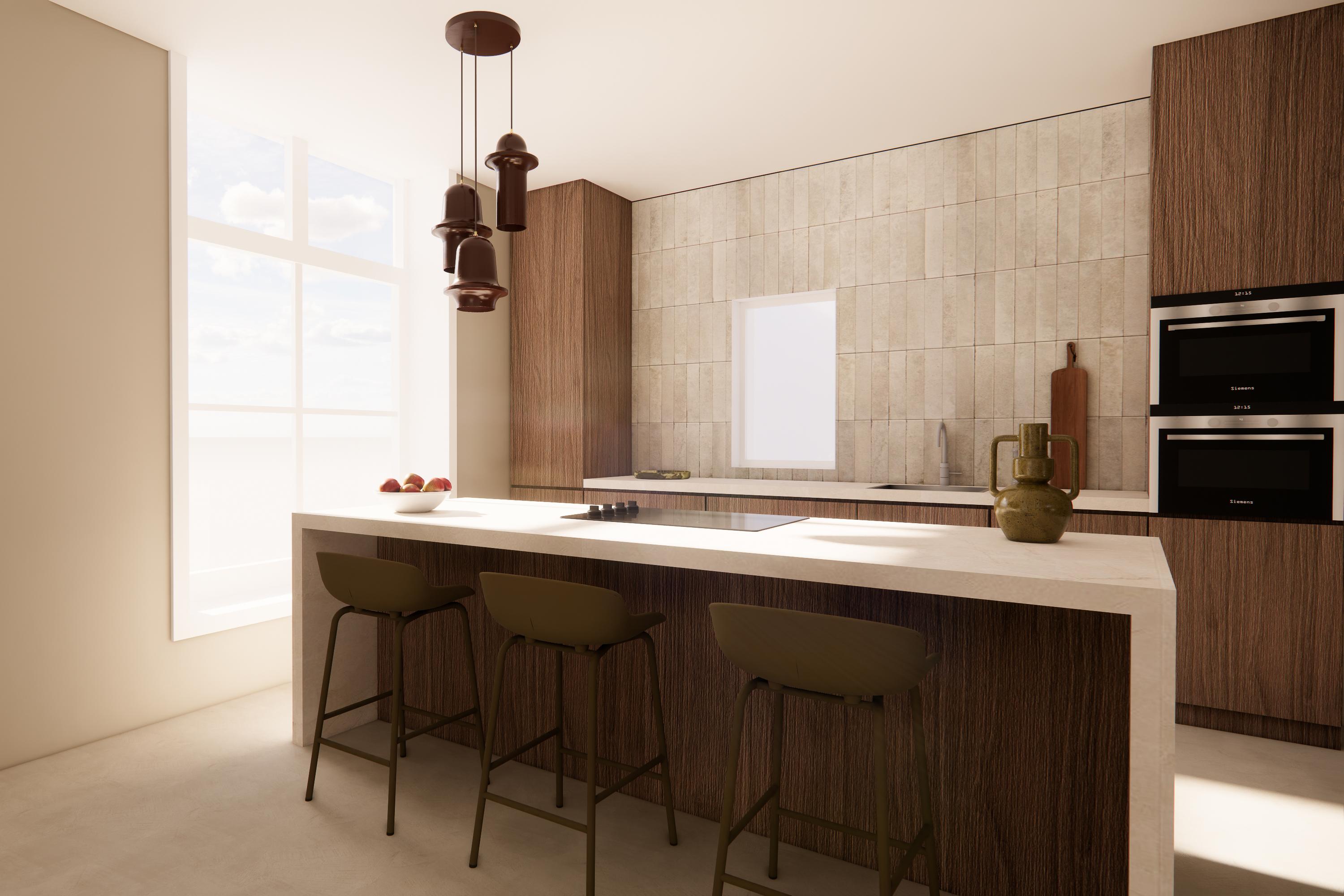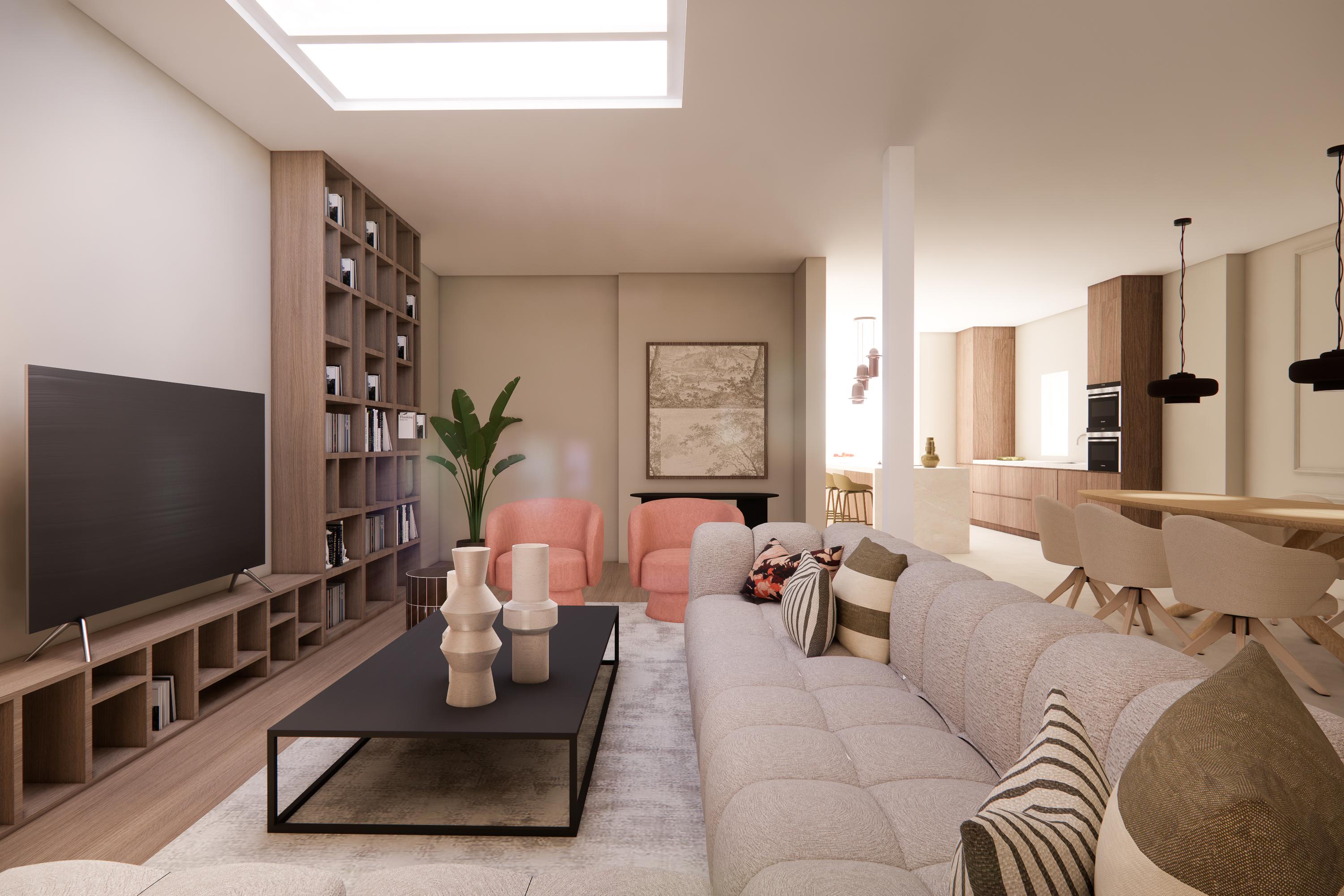A wide contemporary staircase leads to the landing. At the rear is the slightly elevated living room with windows facing west, offering a view towards the marina. On the east side, double doors open onto the roof terrace. During the recent restoration, the ridge of the rear section was left fully exposed, creating a spectacular ceiling height of over 6.5 metres.